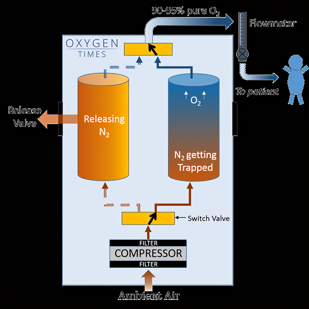 制氧機(jī)空氣的成分(78%的氮?dú)猓?1%的氧氣和1%的其他氣體,如二氧化碳,氬氣等)清楚地表明,空氣主要由兩種氣體組成:氮?dú)夂脱鯕猓ê嫌?jì)99%)。如果從空氣中除去氮?dú)猓瑒t剩余的主要?dú)怏w將是氧氣,其純度約為90-95%。制氧機(jī)將這一思想與變壓吸附(PSA)的基本原理結(jié)合使用,以輸送90-95%的純氧。