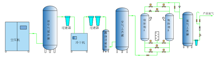 變壓吸附制氮工藝流程分為三個(gè)部分:氣源壓縮、凈化、PSA分離。