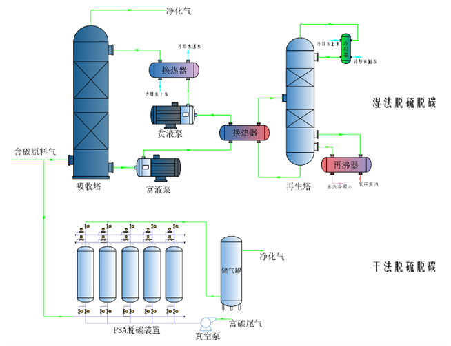 天然氣、合成氣、煉廠氣、煤氣以及窯爐煙氣等中含有硫化氫(H2S)、二氧化硫(SO2)、二氧化碳(CO2)等酸性氣體,需要脫除,方可使用。公司采用軟件模擬和工程實(shí)踐相結(jié)合,對(duì)濕法脫硫工藝、塔器結(jié)構(gòu)、再生溫度等工藝做了大量的優(yōu)化改進(jìn),取得了良好的效果。干法脫硫脫碳工藝采用實(shí)驗(yàn)室測(cè)試和工程實(shí)踐結(jié)合,使用軟件模擬氣流分布,優(yōu)化氣流分布,減小死空間,大大提高了脫除效率,延長(zhǎng)了吸附劑壽命,可以滿足不同用戶工況條件下的脫硫脫碳要求。