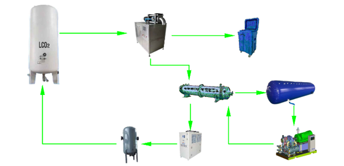 固體干冰是將液體二氧化碳注入干冰制造機(jī)并壓縮制成,有磚狀、柱狀、塊狀和顆粒狀等多種規(guī)格的產(chǎn)品。在干冰生產(chǎn)過程中,有大量液態(tài)二氧化碳?xì)饣斐删薮蟮睦速M(fèi)。