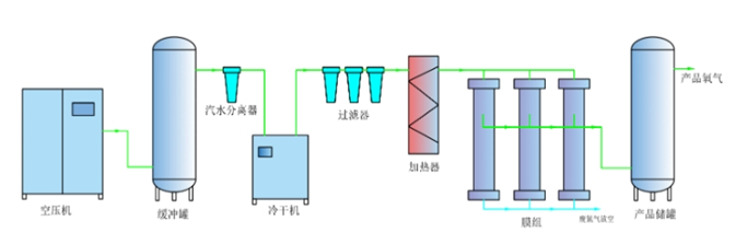 空氣經(jīng)過空壓機提壓后,進入多段過濾器,除去粉塵、油、水后,潔凈空氣進入膜組件進行氧氮分離。一級膜分離制氧得到的氧氣純度為40%左右,對于氧純度要求高的,可以多段膜進行串聯(lián)。