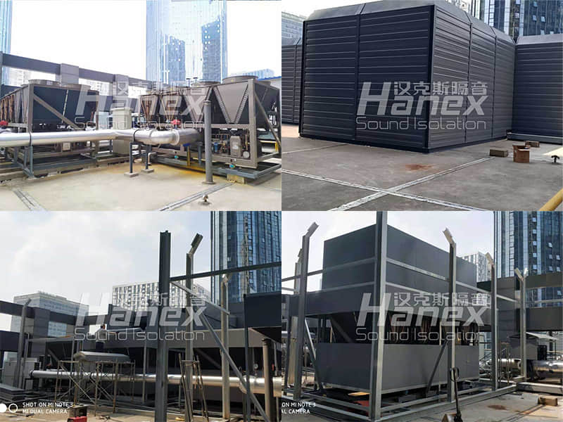 3、根據現場實際情況,空調機組底部的壓縮機周圍無阻擋,我司技術人員發(fā)現壓縮機工作運行時所產生的噪聲往外擴散,影響其周邊環(huán)境。因此,我司技術人員結合以往同類項目案例經驗,采用隔音板對空調機組底部壓縮機四周進行圍擋,控制其工作產生的噪聲往外擴散。同時從空調機組頂部做500mm隔聲掛板,防止壓縮機產生的噪聲從頂部溢出擴散到周圍環(huán)境。
